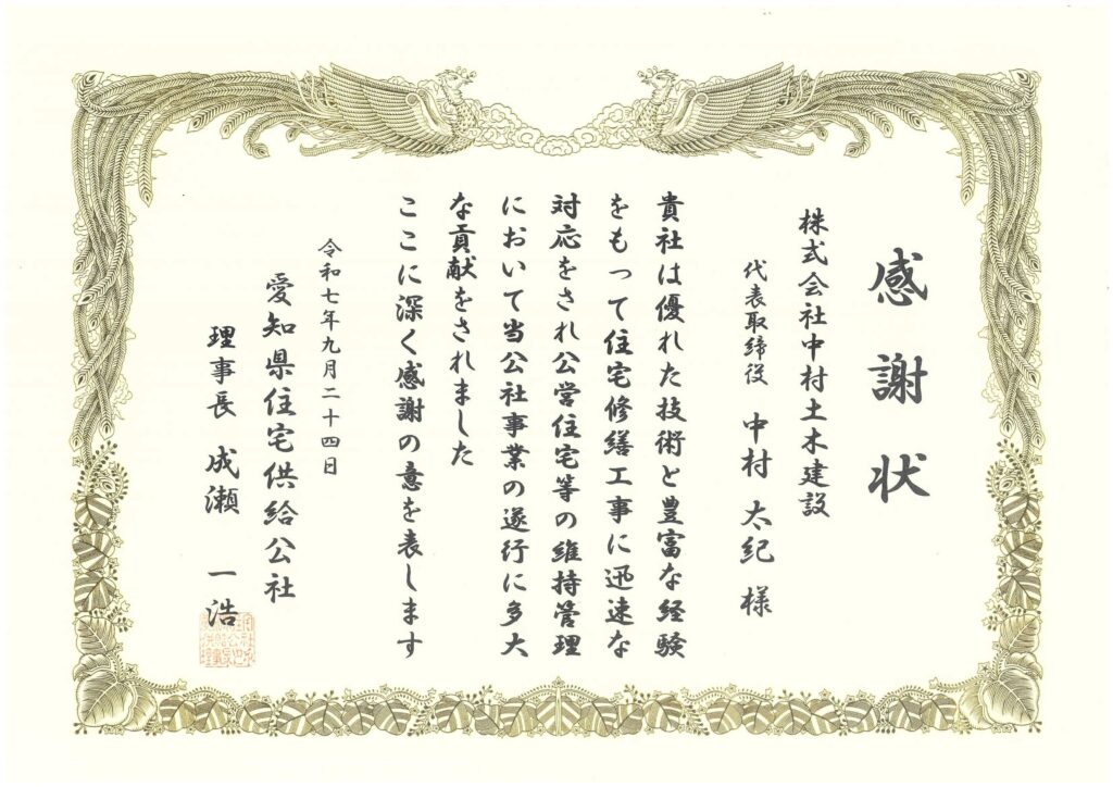 2025年9月24日に愛知県住宅供給公社様より感謝状をいただきました。 今後もナカミライズグループ一同、社会に貢献できる様に尽力して参ります。 ← 【ビジネスホテル寺本からのお知らせ】大浴場・サウナ 一般利用開始のご案内 → 【中村土木建設からのお知らせ】「愛知県健康経営推進企業」に登録されました。